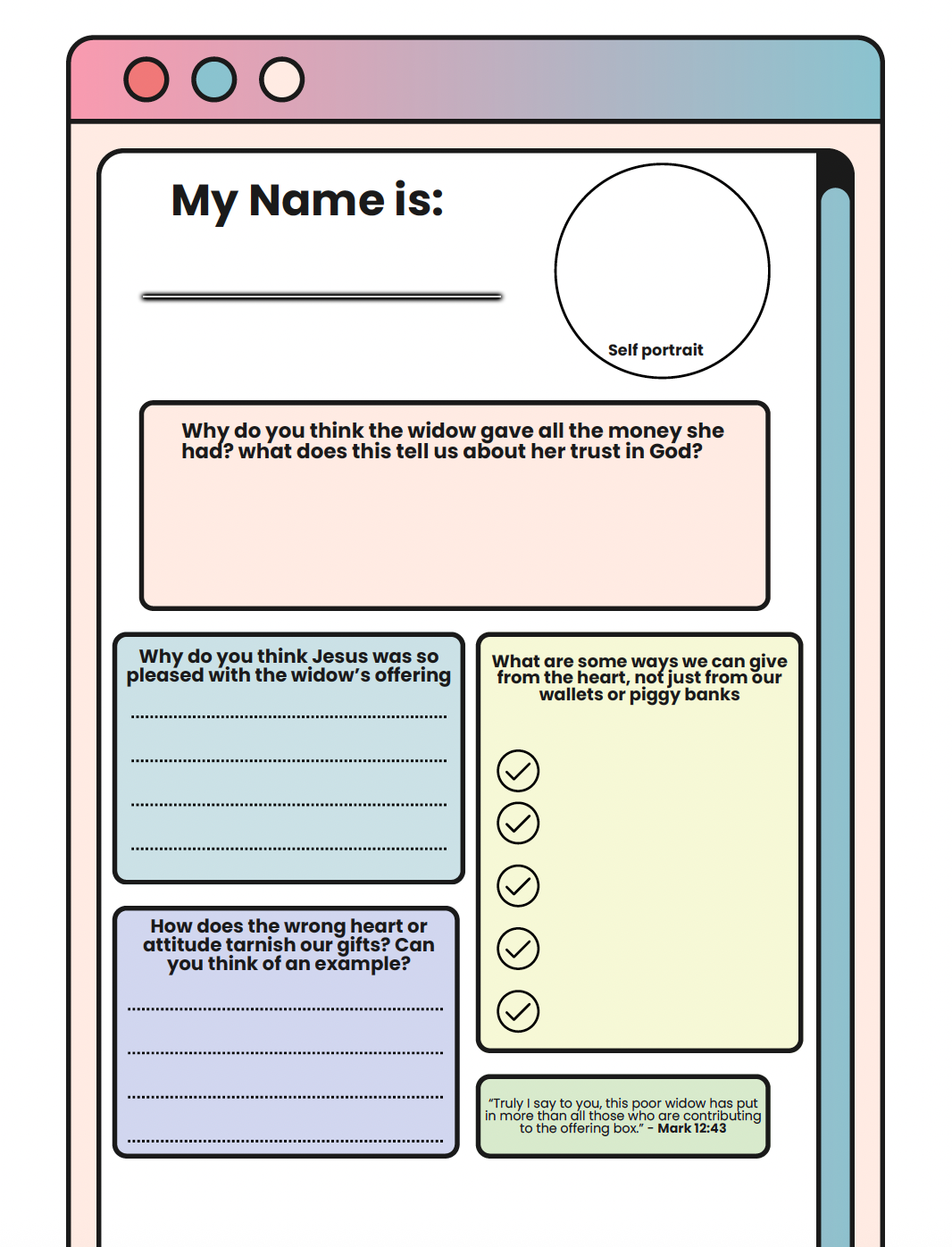 Mark 12:43, “Truly I say to you, this poor widow has put in more than all those who are contributing to the offering box.”